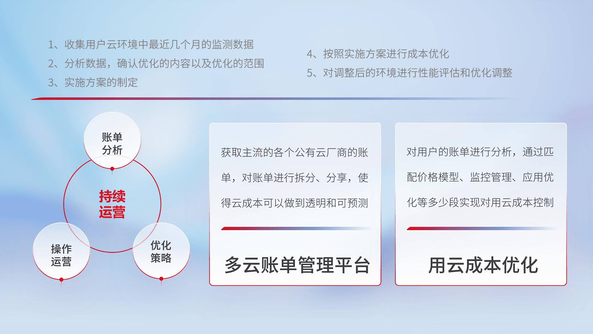 通过多云纳管,,,,以统一的资源数据模型把客户的云资源进行抽象和封装,,,,进而实现对多云资源的统一操作,,,保障云资源管理的可靠性、、稳定性与可用性。。量身定制化运维内容,,配置、、、、开发运维、、、补丁管理、、、、备份、、、监控、、、认证和访问管理、、、、审计和日常巡检等,,保障在用云过程中的可靠度,,,,稳定度以及高可用率。。